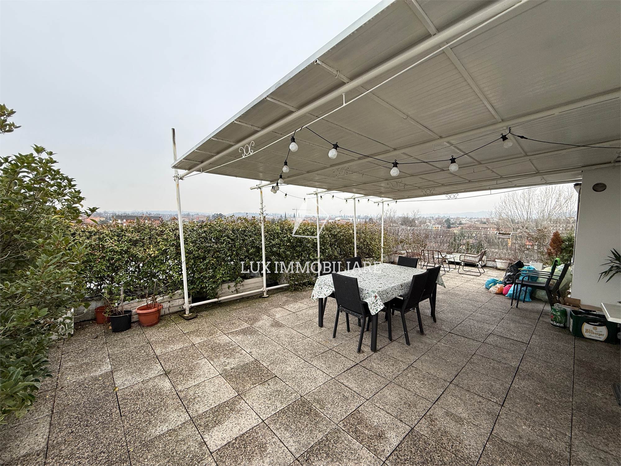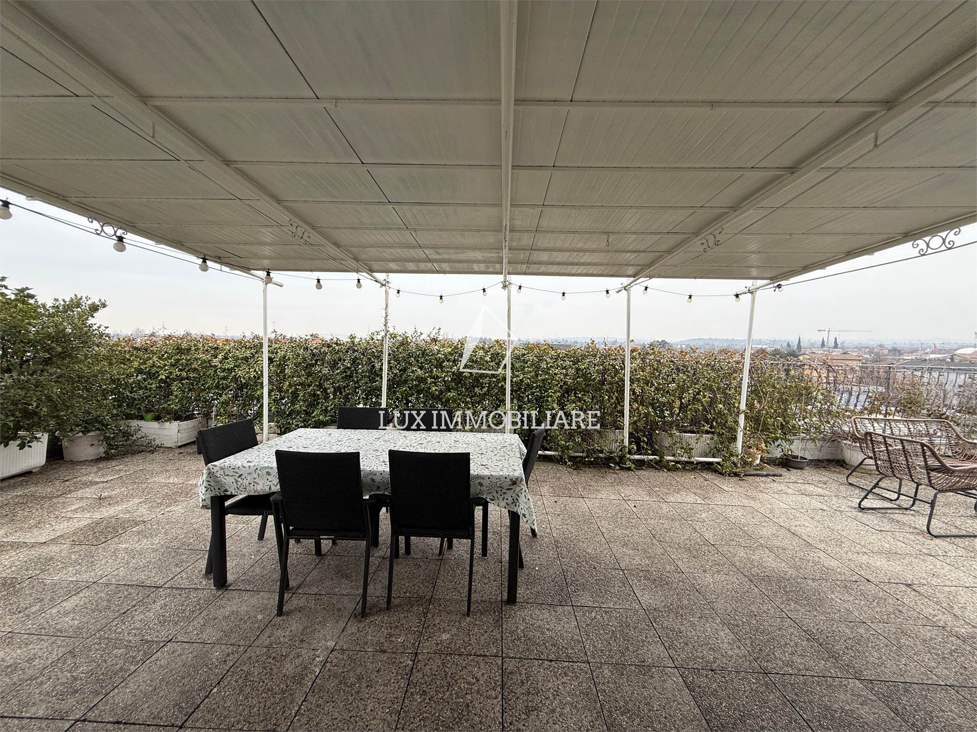 Seto piano: raggiungibile grazie a una scala lineare comoda e ampia, arriviamo al disimpegno del piano superiore dove troviamo il secondo bagno della casa di servizio, e un ampio zona giorno composta da cucina a vista e zona living con divano, un ripostiglio / lavanderia e l’accesso al punto forte dalla soluzione l’ampio terrazzo di 96 mq, dal quale si può ammirare tutto Maranello e i monti modenesi e reggiani nelle giornate soleggiate.