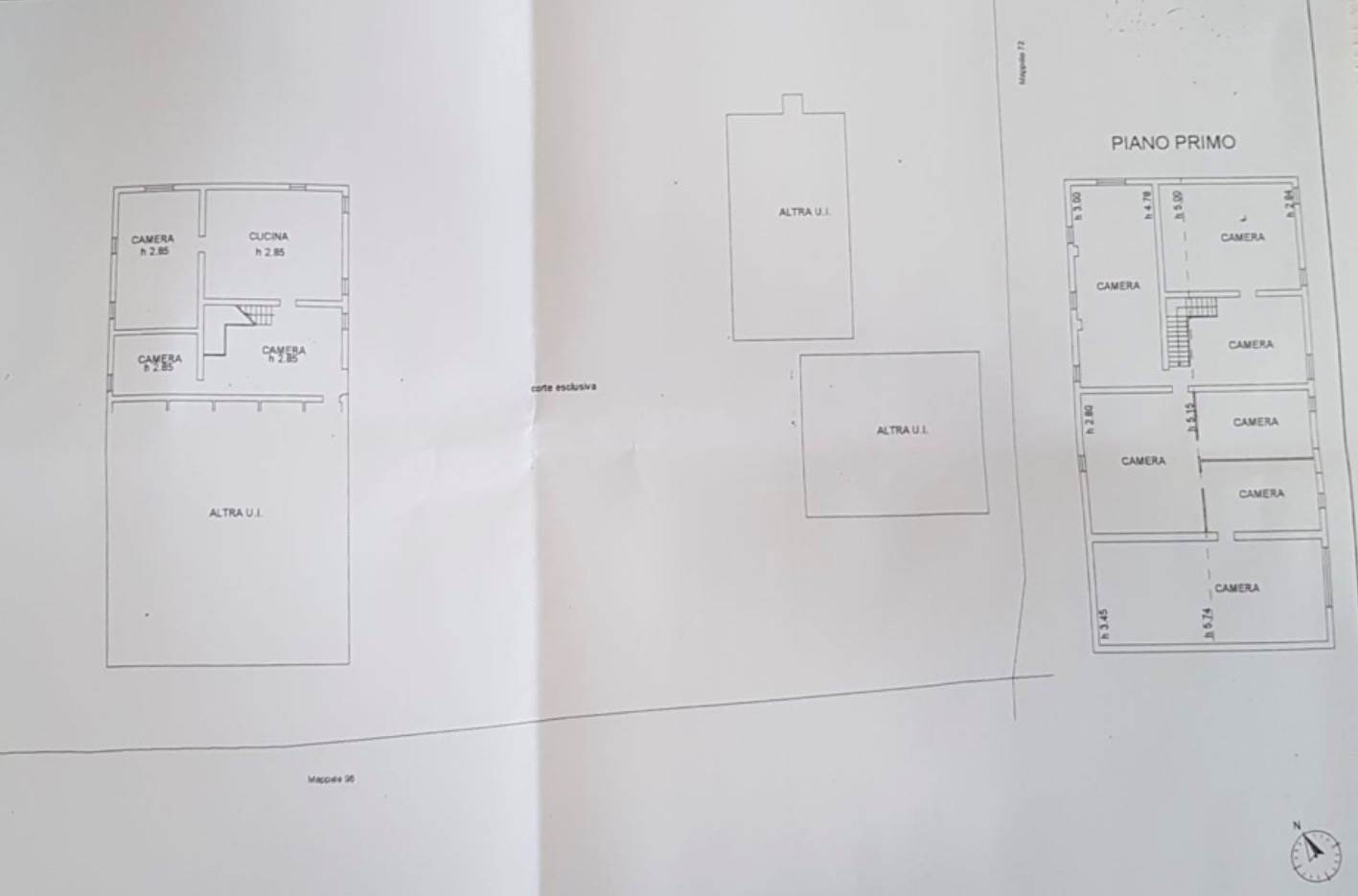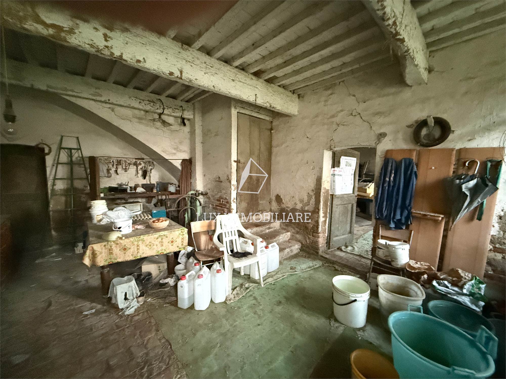 Corpo principale: Disposto su 2 livelli, al piano terra troviamo nella parte a Ovest dell’ingresso una stanza / ingresso, cucina e altre 2 camere, mentre nell’ala Est una stalla e un deposito / garage.